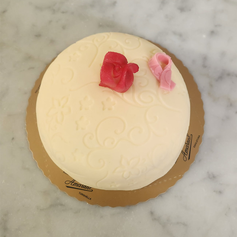 Glutenfri botten, hallonsylt, vaniljkräm, grädde, marsipan, dekorerad med marsipanblomma och rosa band i marsipan.